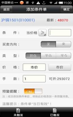 ◇ 成功添加條件單后,將按此價格添加一條預警消息。